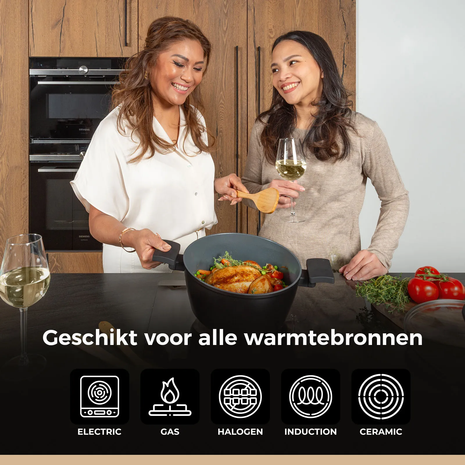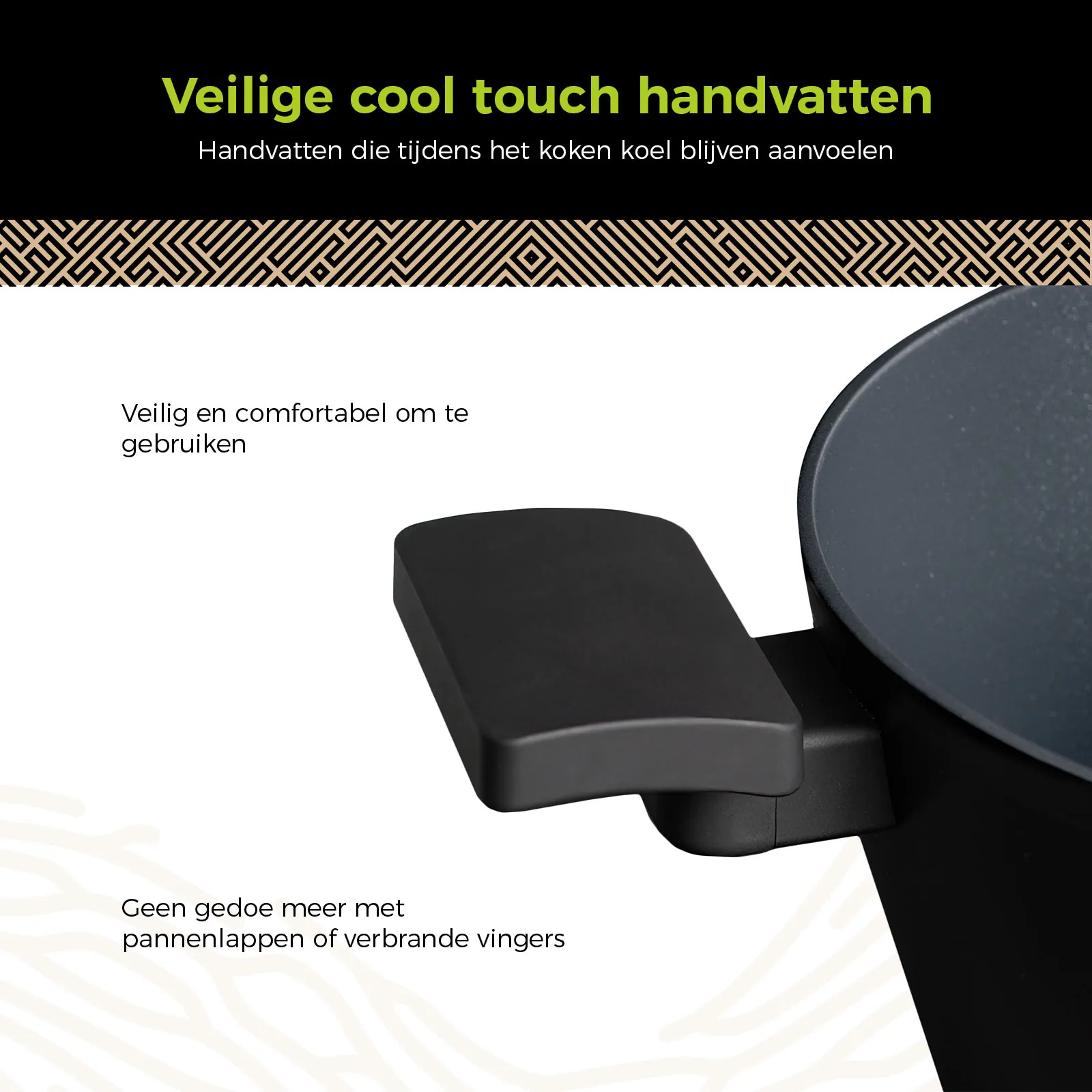 De pannen van BE Living zijn voorzien van cool touch handvatten, die tijdens het koken koel blijven aanvoelen. Dit maakt ze niet alleen veiliger in gebruik, maar ook comfortabeler om te gebruiken. Geen gedoe meer met pannenlappen of verbrande vingers – gewoon zorgeloos en aangenaam koken.