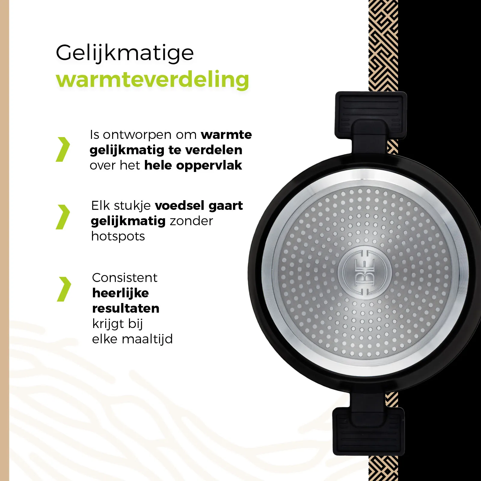 Dankzij het doordachte ontwerp wordt de warmte gelijkmatig over de pan verdeeld. Geen last meer van ongelijkmatig gegaard voedsel – iedere hap wordt perfect bereid.