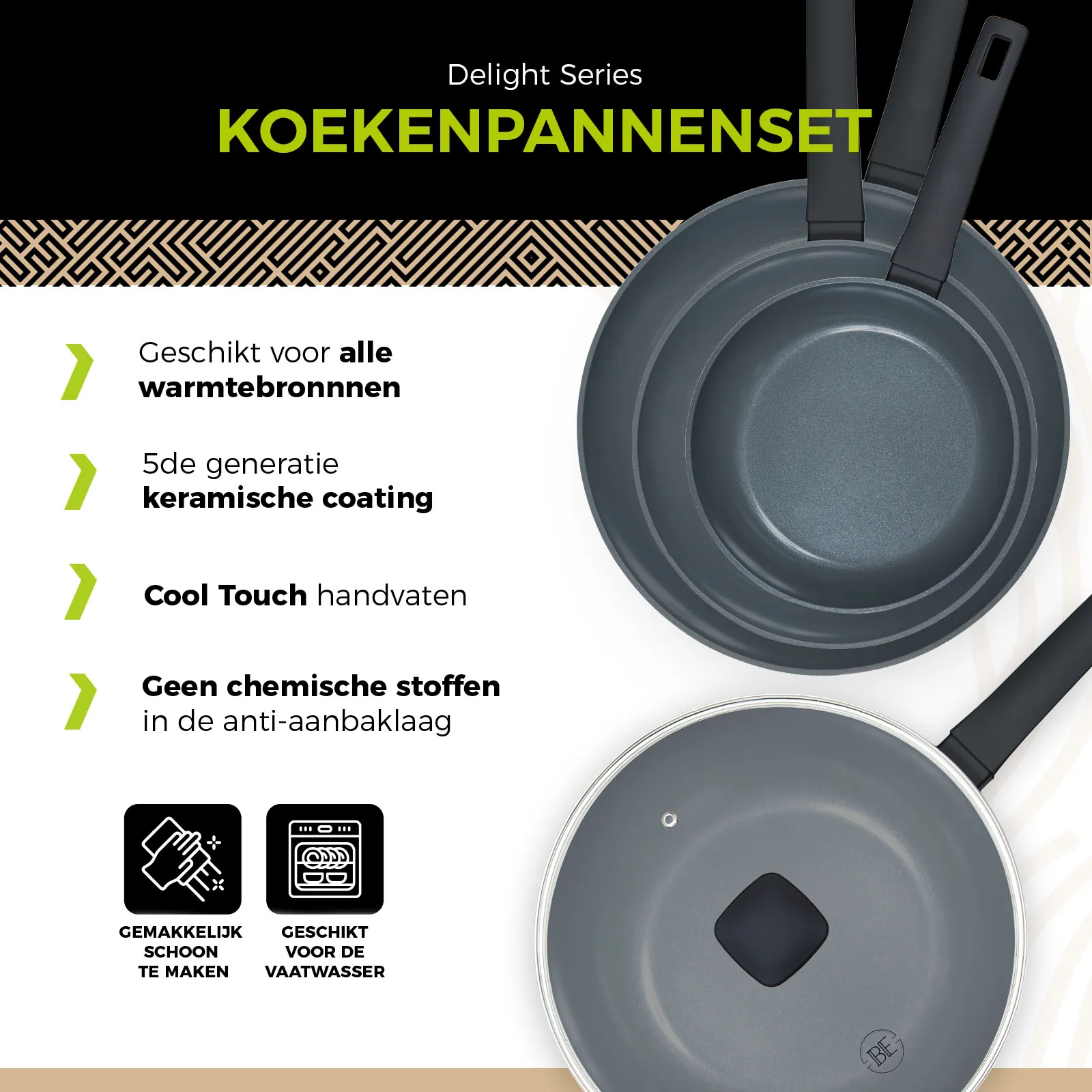 Ontdek BE Living: waar innovatie en stijl samenkomen. Onze pannen zijn ontworpen voor ultiem kookgemak op alle warmtebronnen, met een luxe design en een geavanceerde 5de graads keramische coating voor optimale anti-aanbakeigenschappen. Voorzien van cool touch handvaten en volledig PFAS-vrij, bieden wij gezonde kookoplossingen zonder compromissen op kwaliteit of veiligheid. Bekijk ook onze brandfilm: