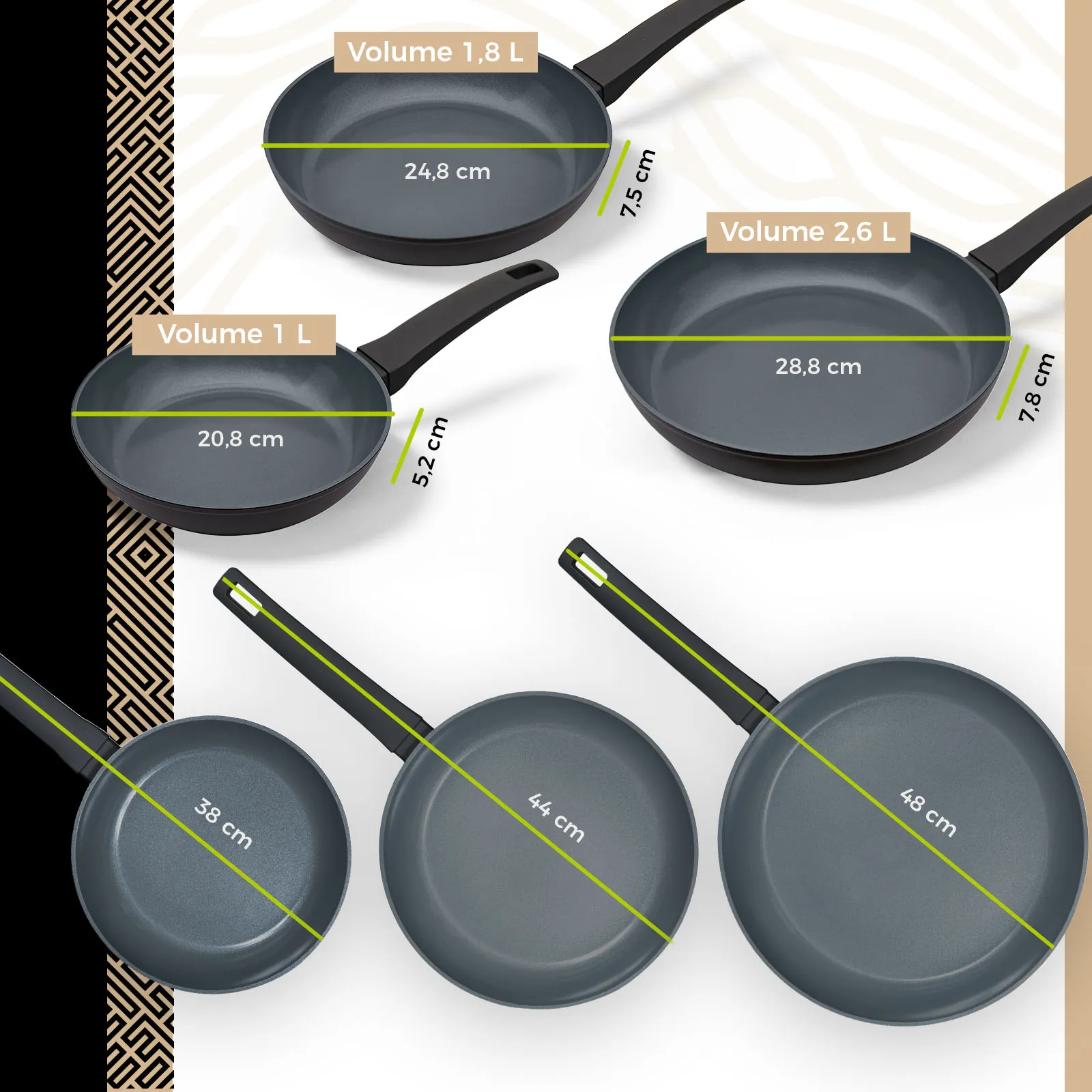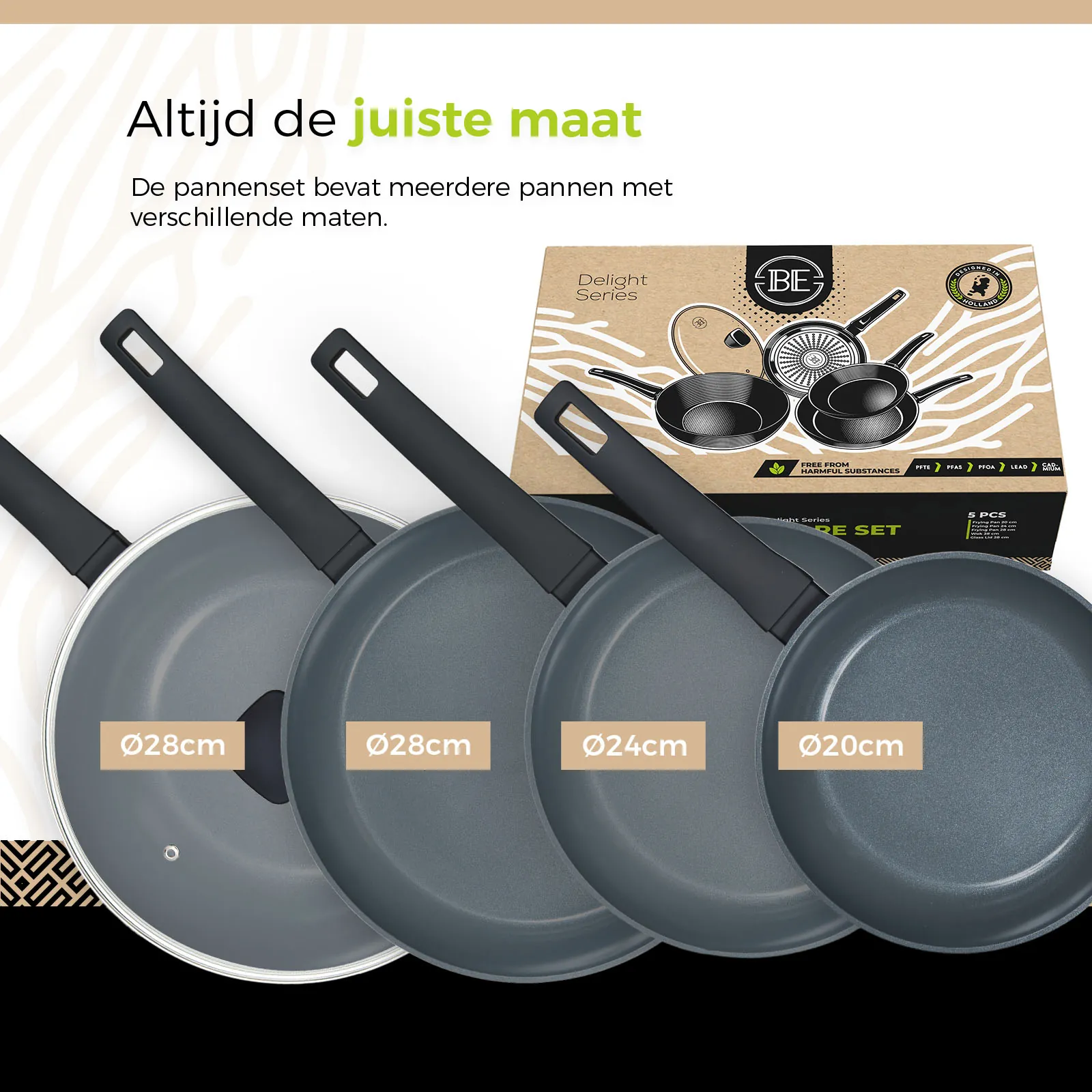 - Afmetingen: Ø 20, 24 en 28 cm