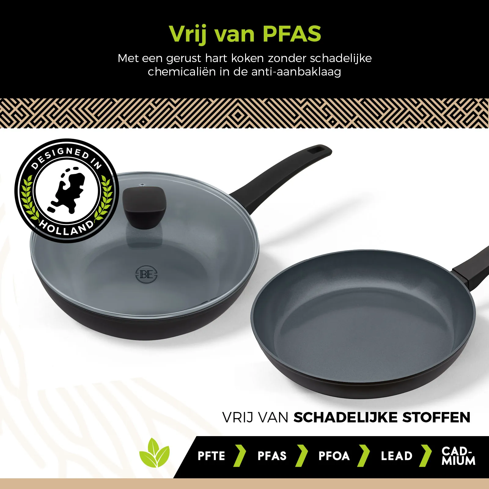 Bij BE Living staat jouw veiligheid centraal. De pannen zijn volledig vrij van PFAS, zodat je met een gerust hart kunt koken zonder schadelijke chemicaliën die in sommige anti-aanbaklagen worden aangetroffen. Dit maakt ze een verantwoorde keuze voor jou en je gezin.