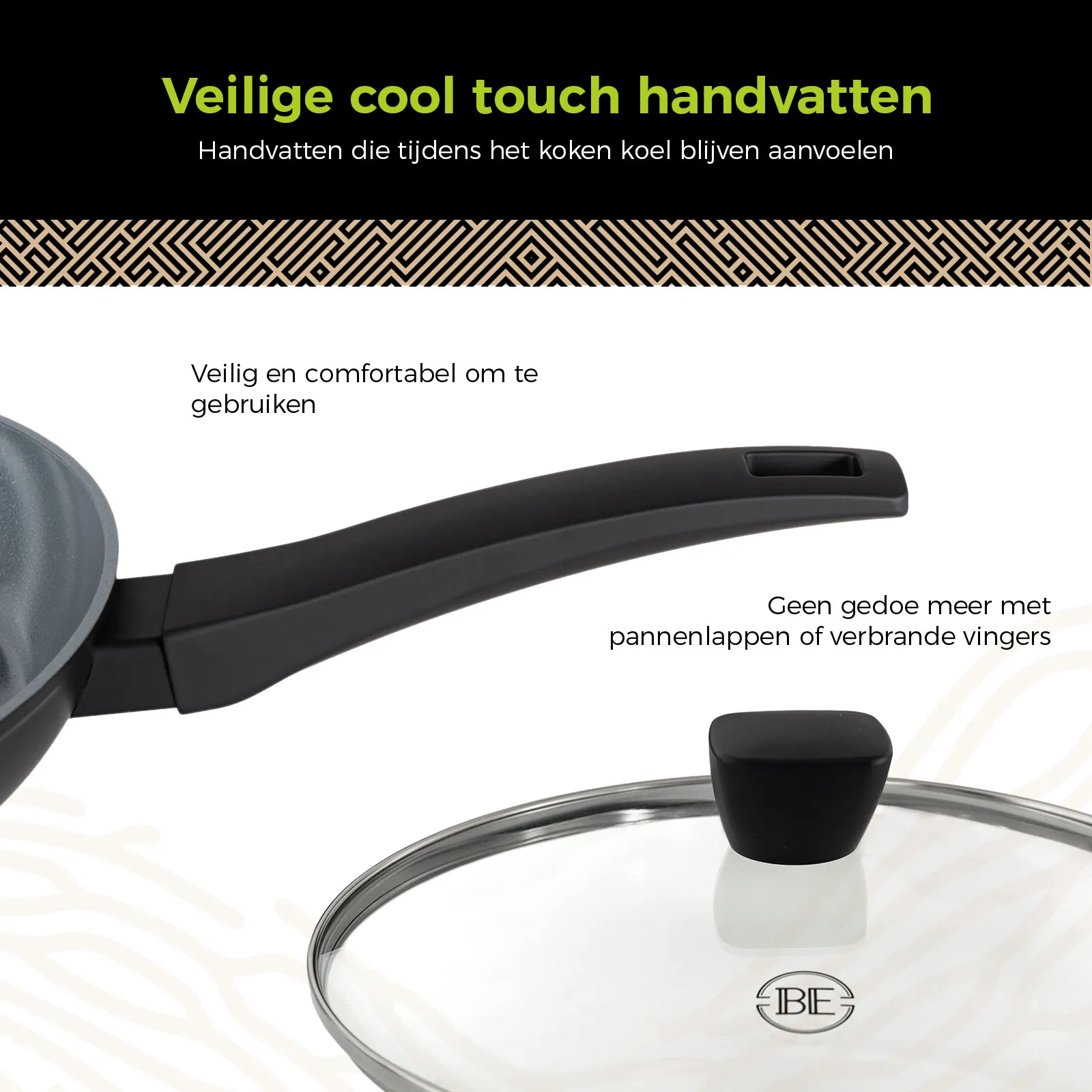 De pannen van BE Living zijn voorzien van cool touch handvatten, die tijdens het koken koel blijven aanvoelen. Dit maakt ze niet alleen veiliger in gebruik, maar ook comfortabeler om te gebruiken. Geen gedoe meer met pannenlappen of verbrande vingers – gewoon zorgeloos en aangenaam koken.