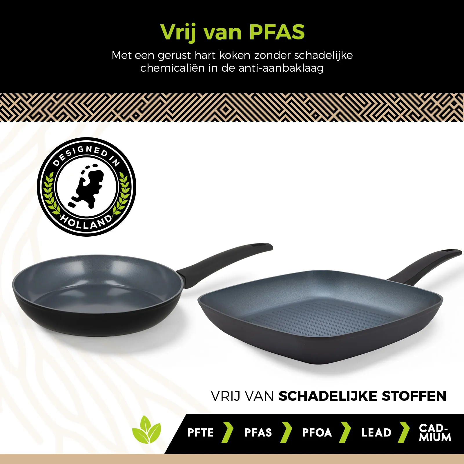 - Afmetingen: Koekenpan Ø 20, 24 en 28 cm + Grillpan Ø 28 cm