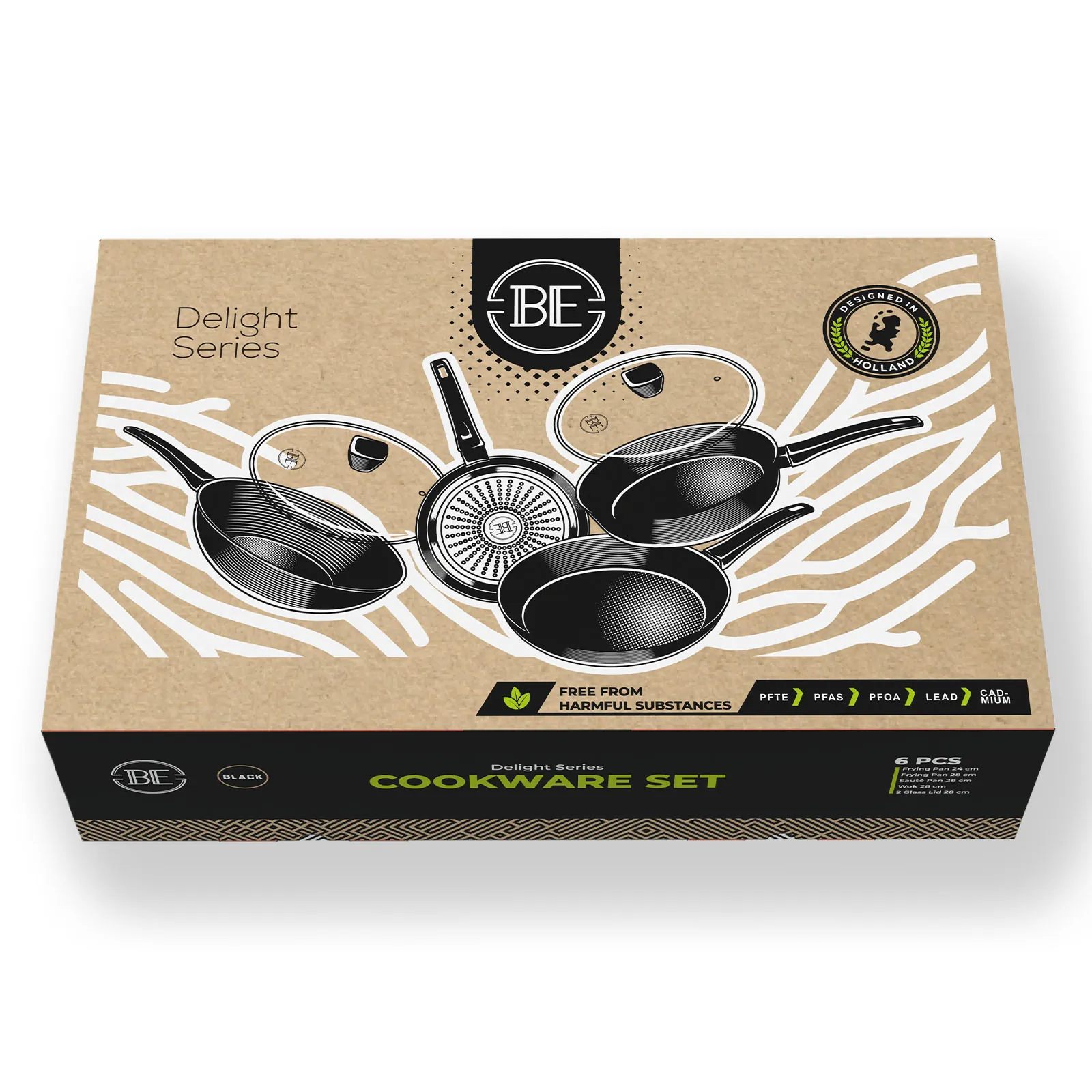 - BE Living Delight Series Koekenpan van Ø 24 en 28 cm, Wokpan Ø 28 cm + Sauspan Ø 28 cm