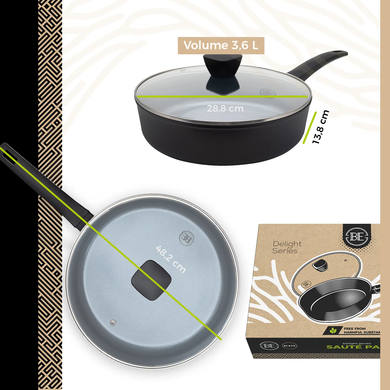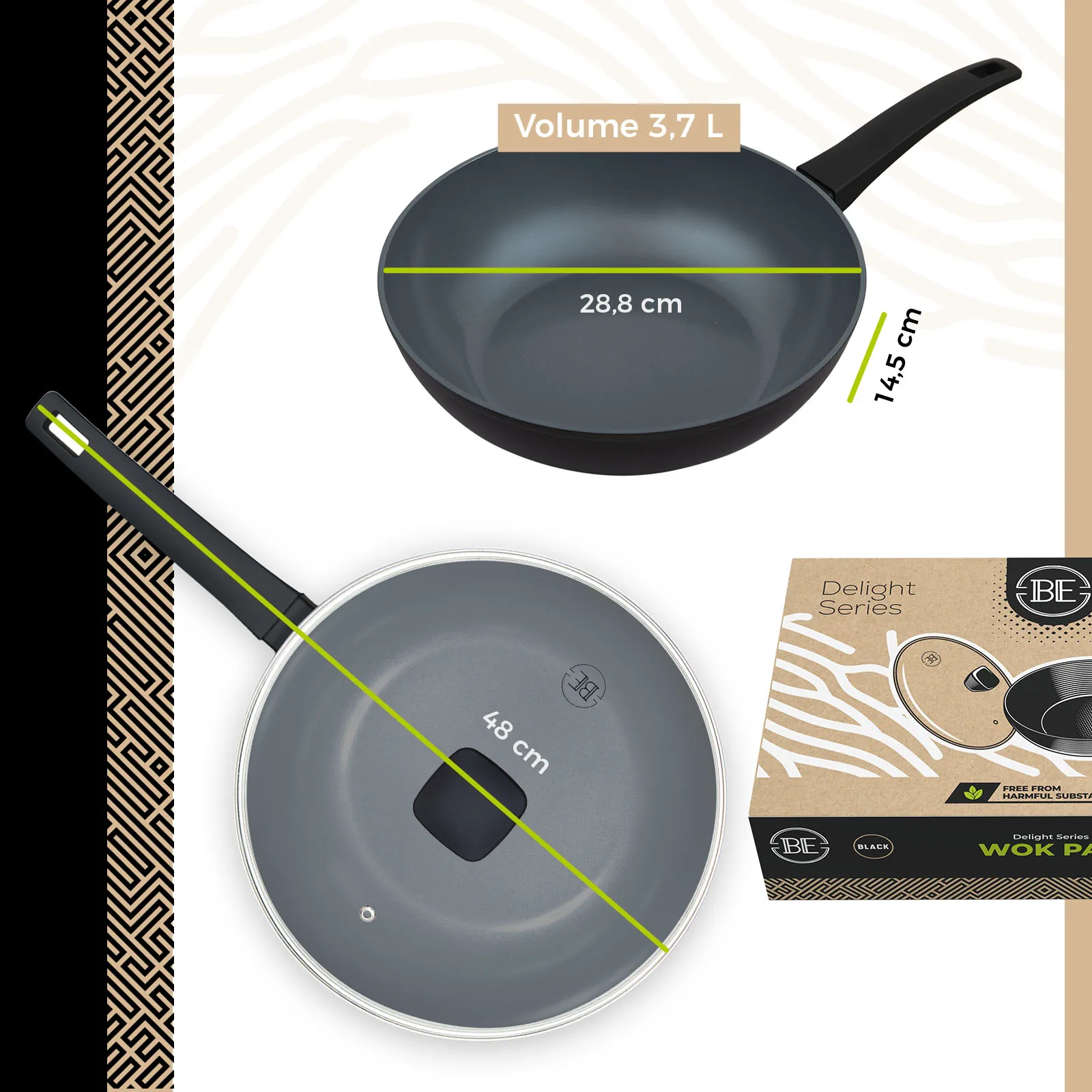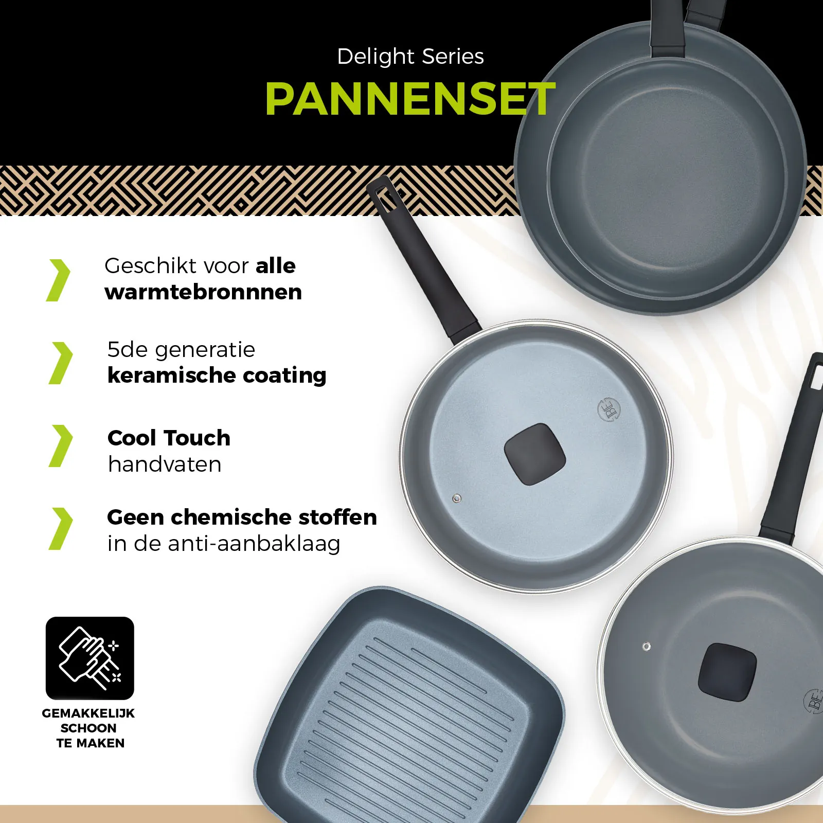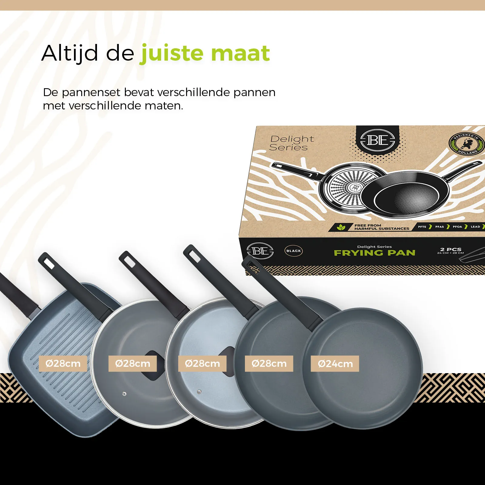 - BE Living Delight Series Koekenpan van Ø 24 en 28 cm, Wokpan Ø 28 cm + Hapjespan Ø 28 cm + Grillpan Ø 28 cm