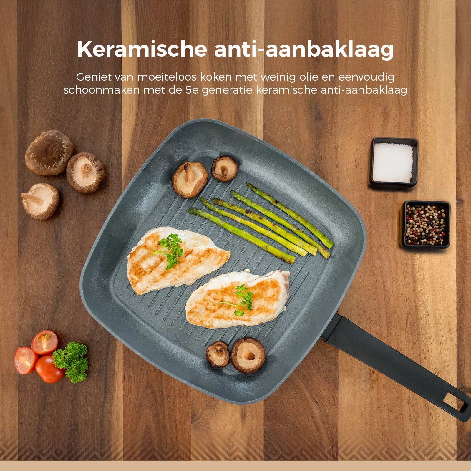 De geavanceerde 5e generatie keramische anti-aanbaklaag biedt uitzonderlijke prestaties. Geniet van moeiteloos koken met weinig olie en eenvoudig schoonmaken. Deze technologie maakt elke maaltijd een plezier om te bereiden.