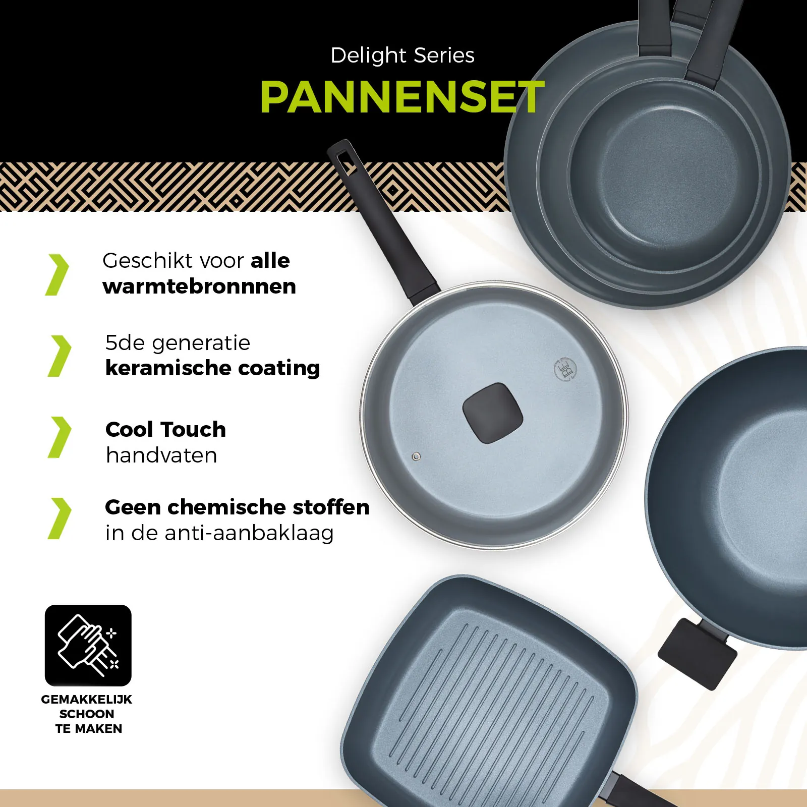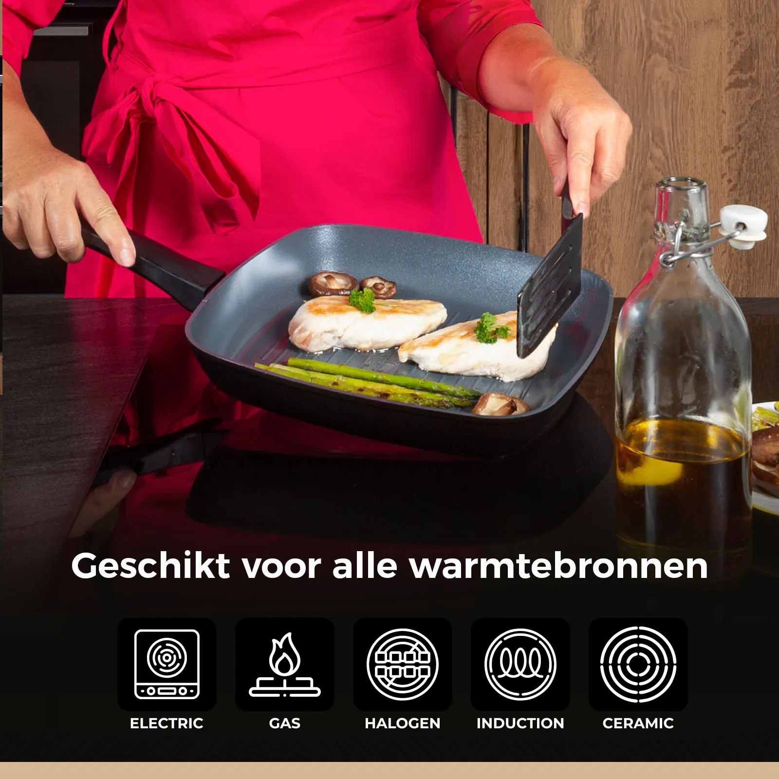 Elke pan in deze set warmt snel en gelijkmatig op. Dat betekent: minder energieverbruik en altijd perfecte resultaten – of je nu een steak grilt of groenten roerbakt.