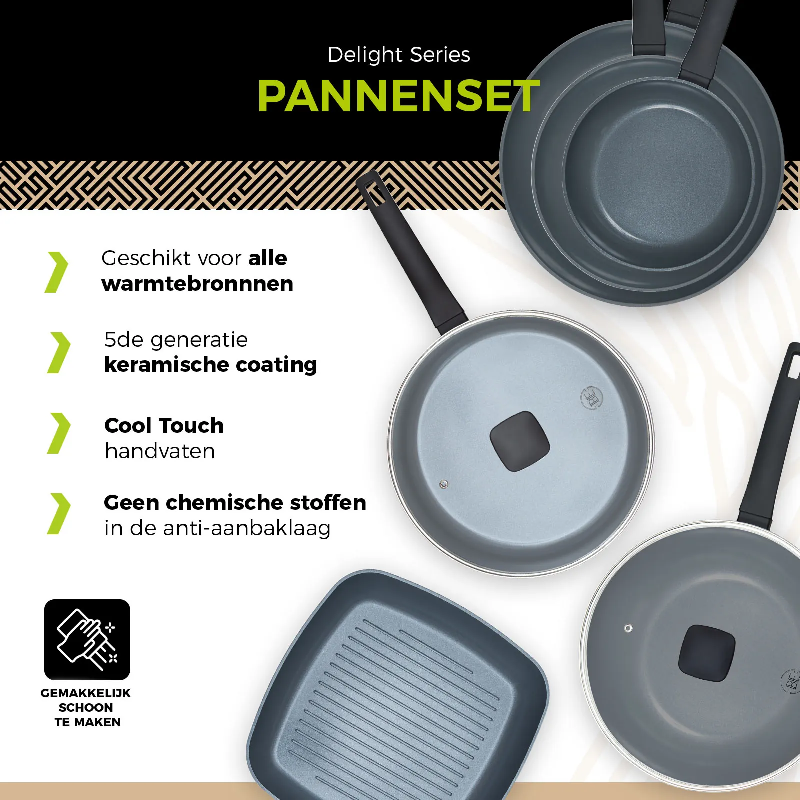 - BE Living Delight Series Koekenpan Ø 20, 24 en 28 cm, Wokpan Ø 28 cm + Hapjespan Ø 28 cm + Grillpan Ø 28 cm