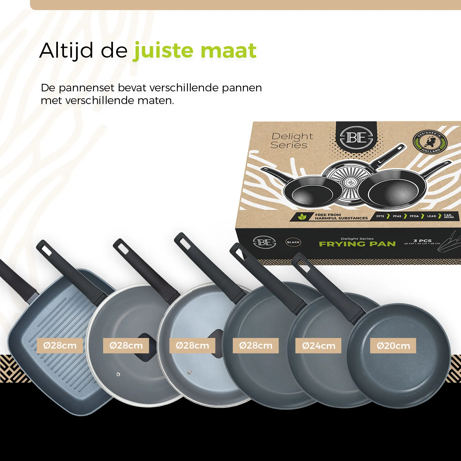 - Afmetingen: Koekenpan Ø 20, 24 en 28 cm, Wokpan Ø 28 cm + Hapjespan Ø 28 cm + Grillpan Ø 28 cm