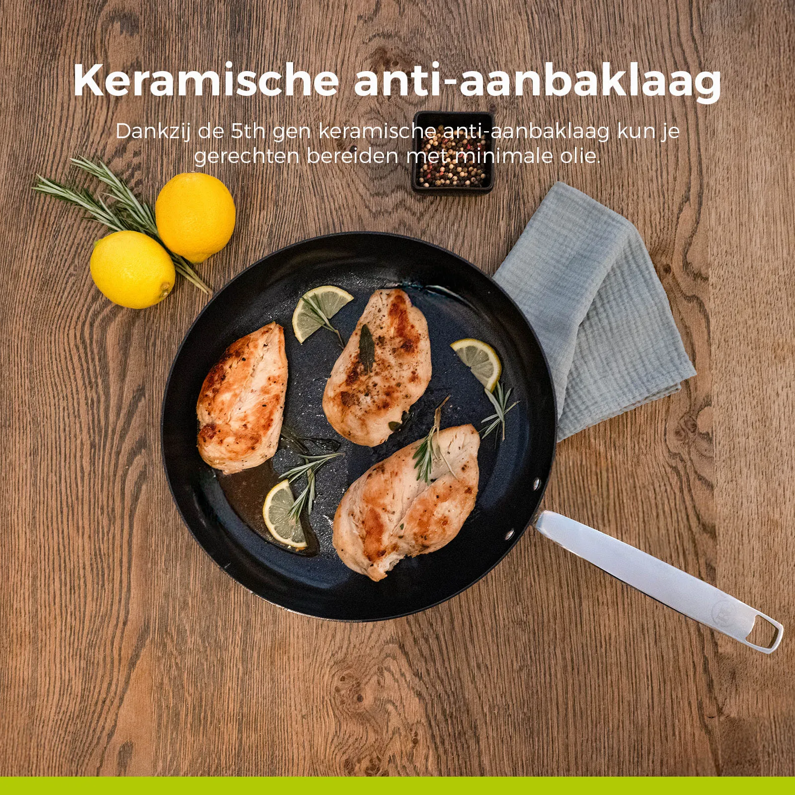 De geavanceerde 5e generatie keramische anti-aanbaklaag zorgt voor uitstekende prestaties. Koken gaat moeiteloos met weinig olie en de pannen zijn bovendien eenvoudig schoon te maken. Zo wordt elke maaltijd bereiden een plezier.