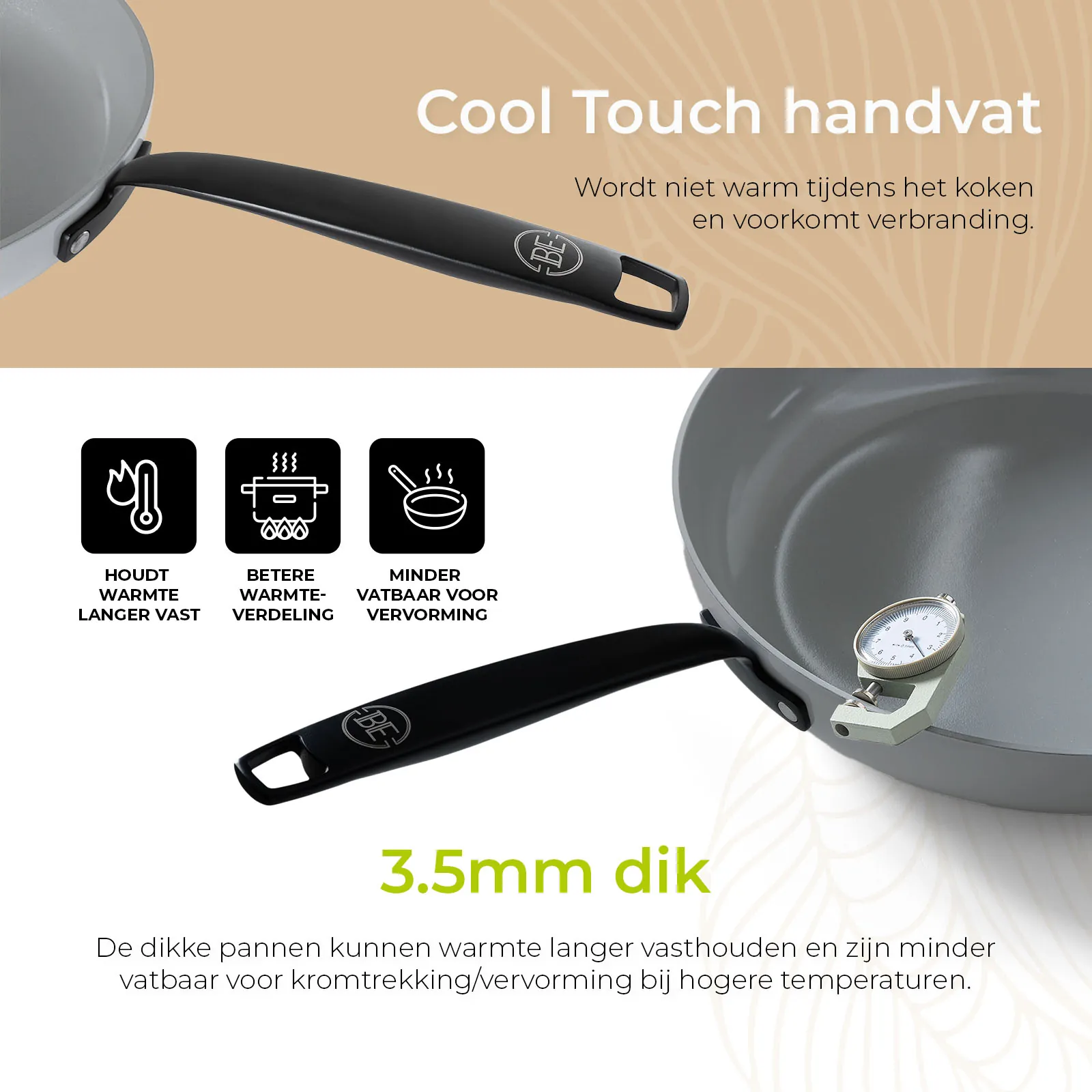 De pannen van BE Living zijn voorzien van cool touch handvatten, die tijdens het koken koel blijven aanvoelen. Dit maakt de pannen niet alleen veiliger in gebruik, maar ook comfortabeler om te gebruiken. Geen gedoe meer met pannenlappen of verbrande vingers – gewoon zorgeloos en aangenaam koken.