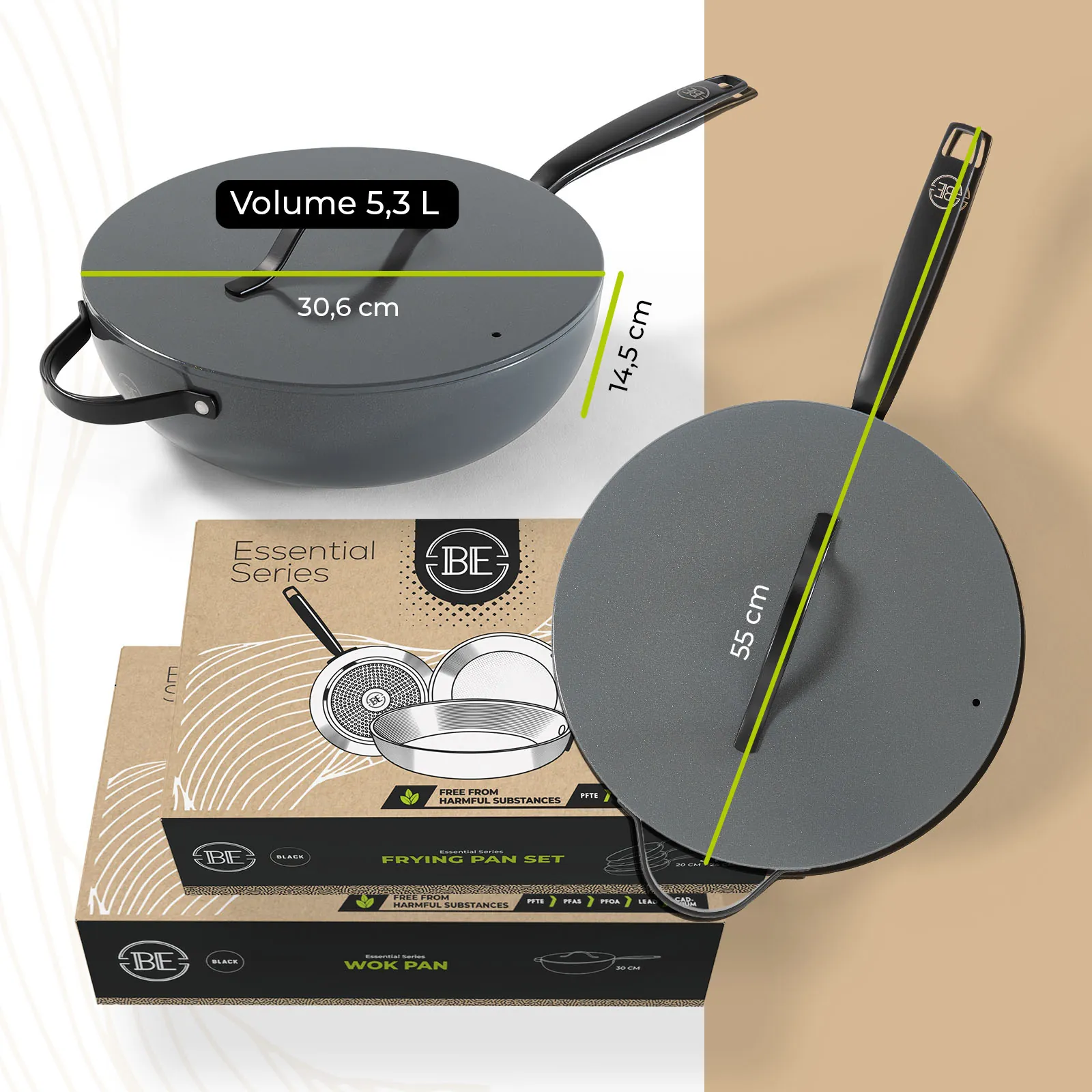 Bij BE Living staat jouw veiligheid centraal. De pannen zijn volledig vrij van PFAS, zodat je met een gerust hart kunt koken zonder schadelijke chemicaliën die in sommige anti-aanbaklagen worden aangetroffen. Dit maakt de pannenset een verantwoorde keuze voor jou en je gezin.