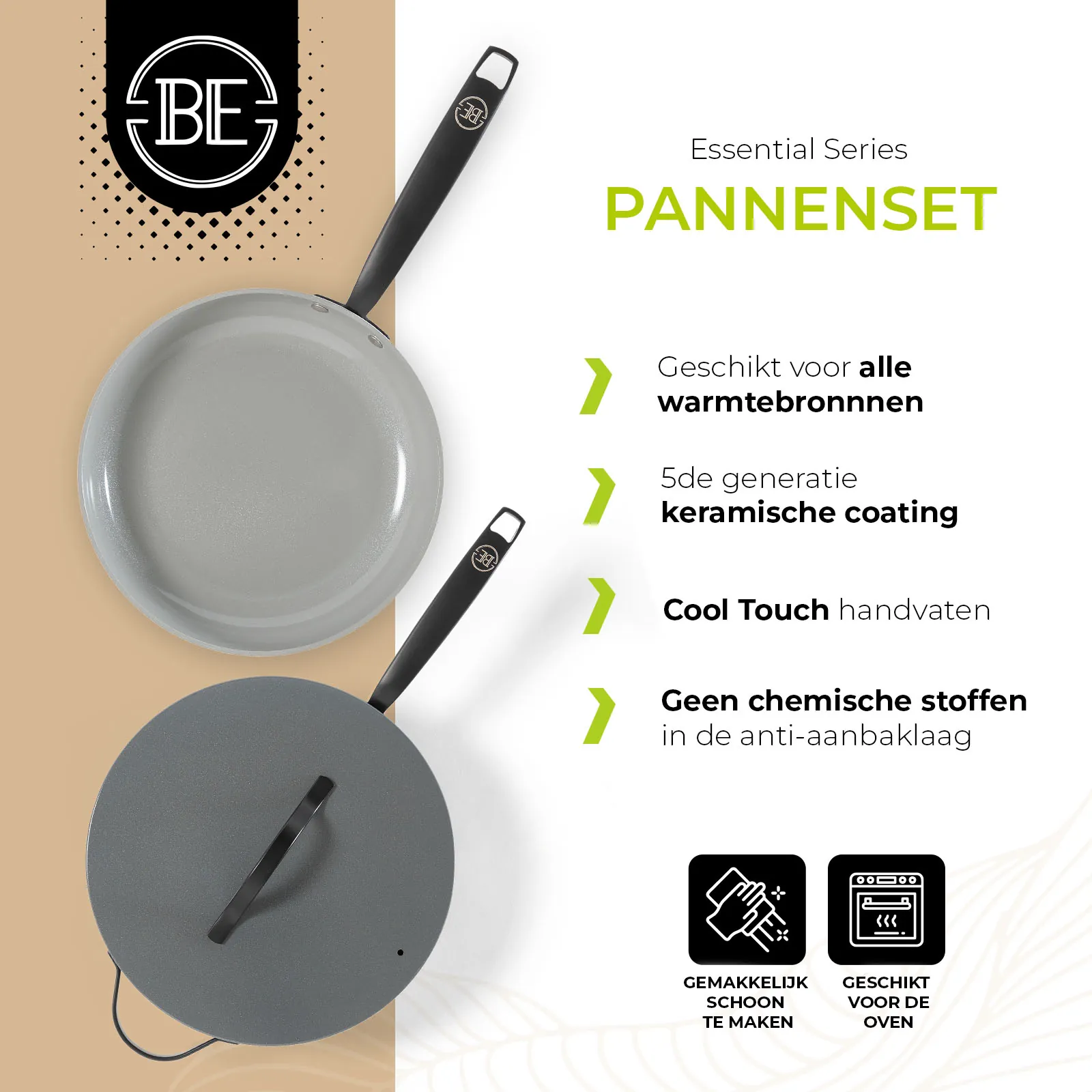 Ontdek BE Living: waar innovatie en stijl samenkomen. Onze pannen zijn ontworpen voor ultiem kookgemak op alle warmtebronnen, met een luxe design en een geavanceerde 5de graads keramische coating voor optimale anti-aanbakeigenschappen. Voorzien van cool touch handvaten en volledig PFAS-vrij, bieden wij gezonde kookoplossingen zonder compromissen op kwaliteit of veiligheid. Bekijk ook onze brandfilm: