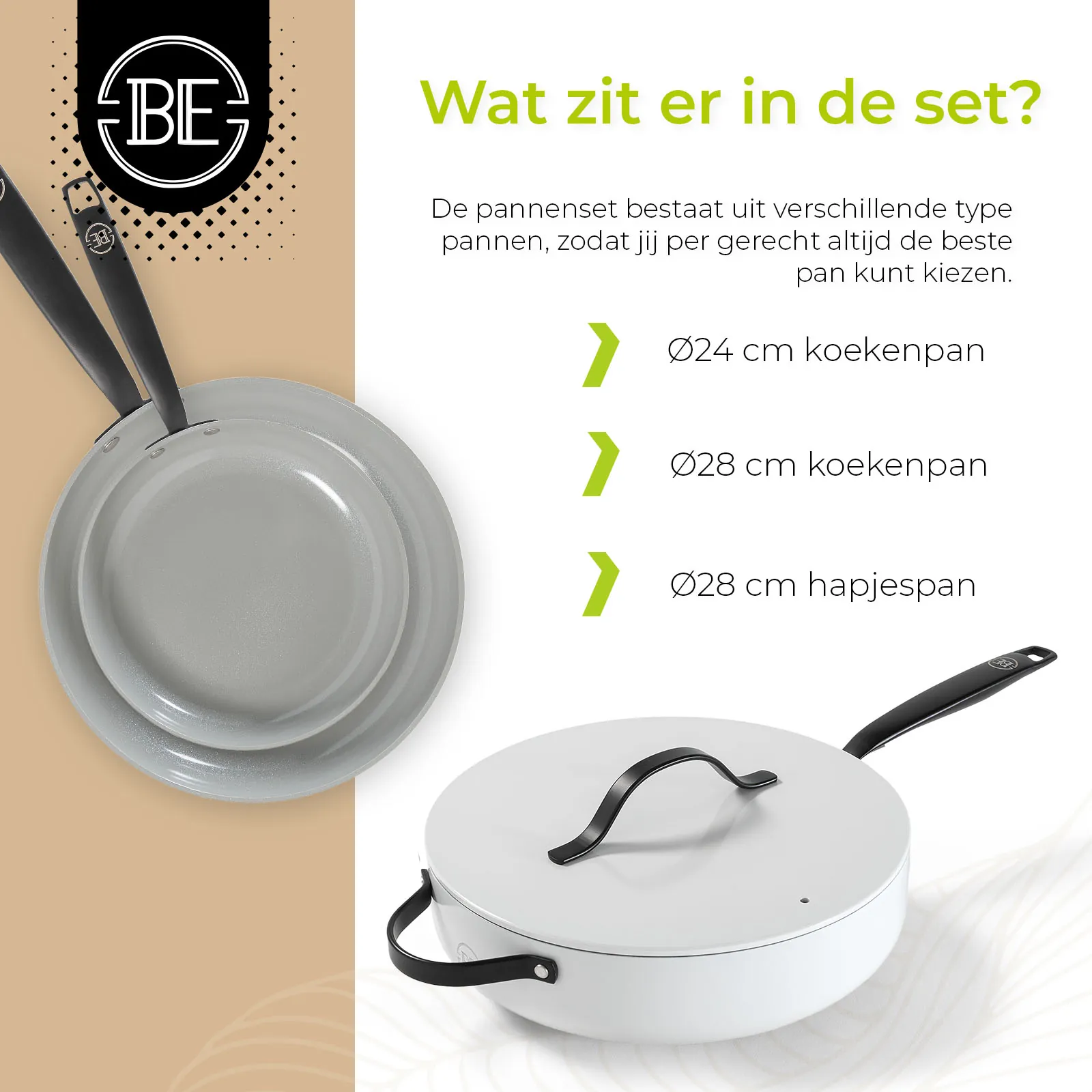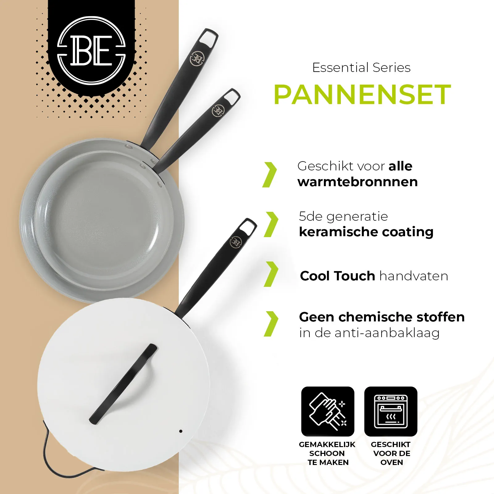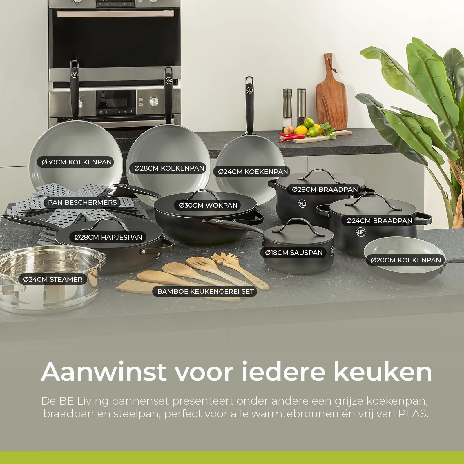 Ontdek BE Living: waar innovatie en stijl samenkomen. Onze pannen zijn ontworpen voor ultiem kookgemak op alle warmtebronnen, met een luxe design en een geavanceerde 5de graads keramische coating voor optimale anti-aanbakeigenschappen. Voorzien van cool touch handvaten en volledig PFAS-vrij, bieden wij gezonde kookoplossingen zonder compromissen op kwaliteit of veiligheid. Bekijk ook onze brandfilm: