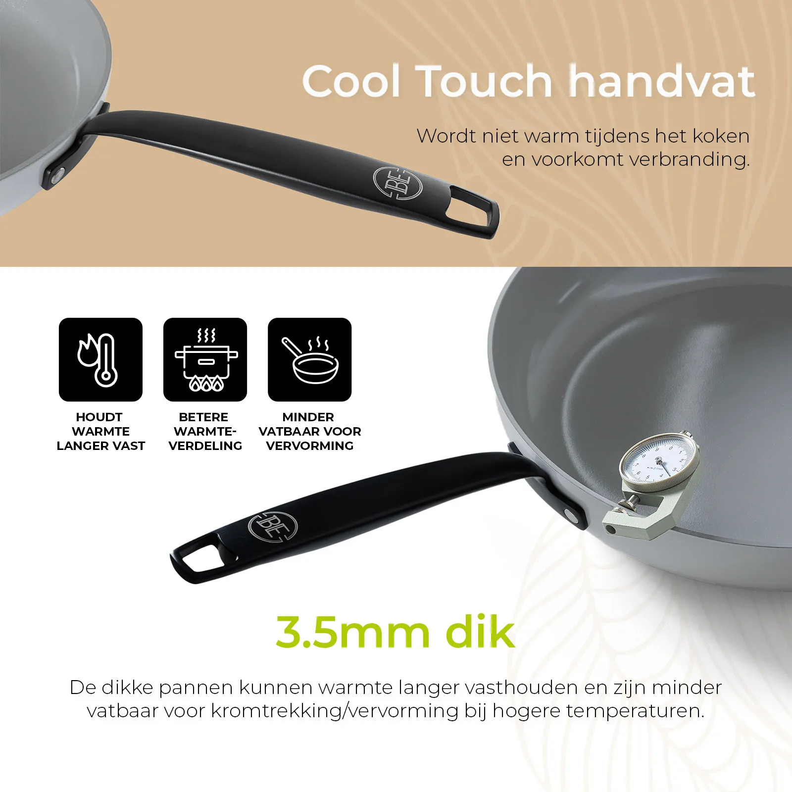 De pannen van BE Living zijn voorzien van cool touch handvatten, die tijdens het koken koel blijven aanvoelen. Dit maakt de pannen niet alleen veiliger in gebruik, maar ook comfortabeler om te gebruiken. Geen gedoe meer met pannenlappen of verbrande vingers – gewoon zorgeloos en aangenaam koken.
