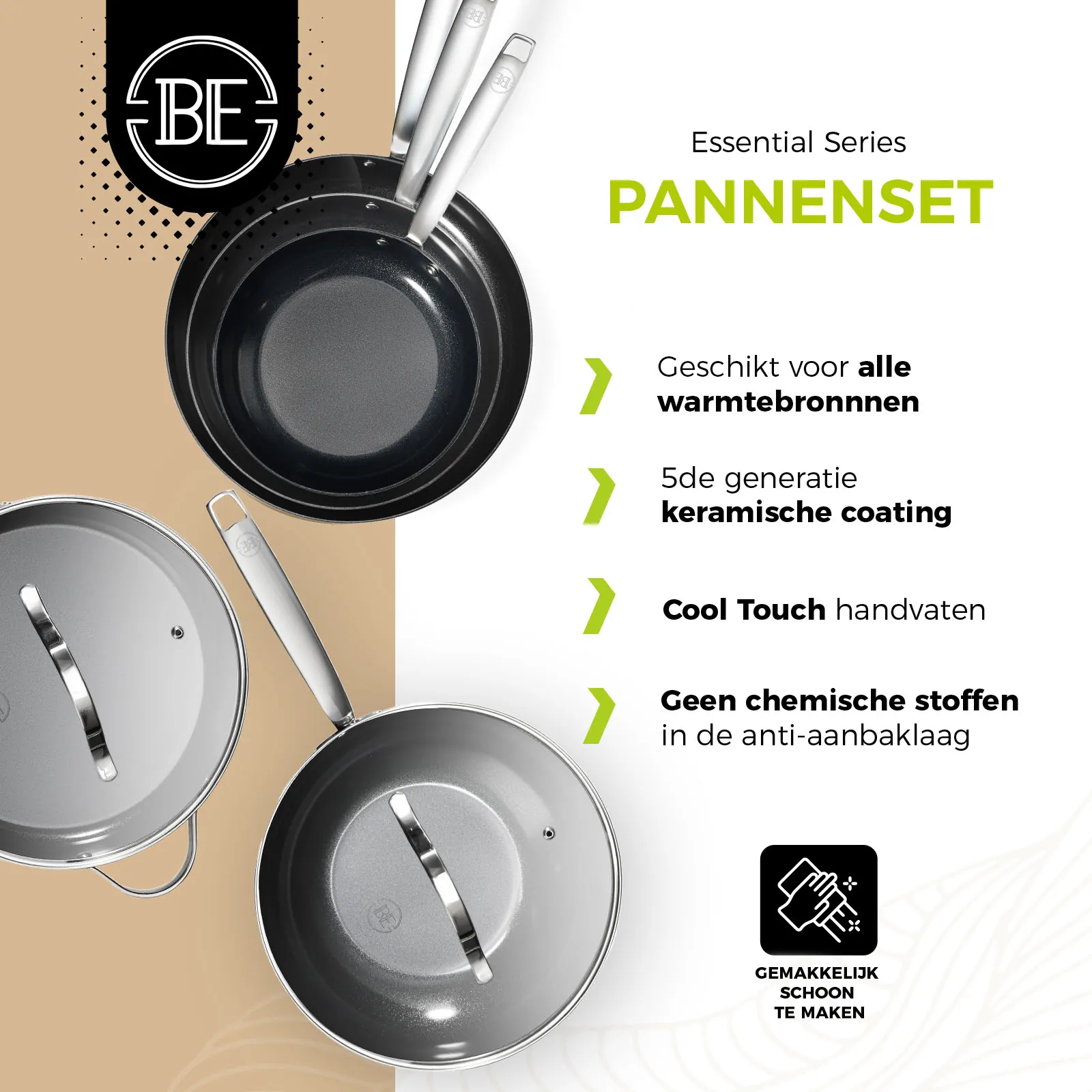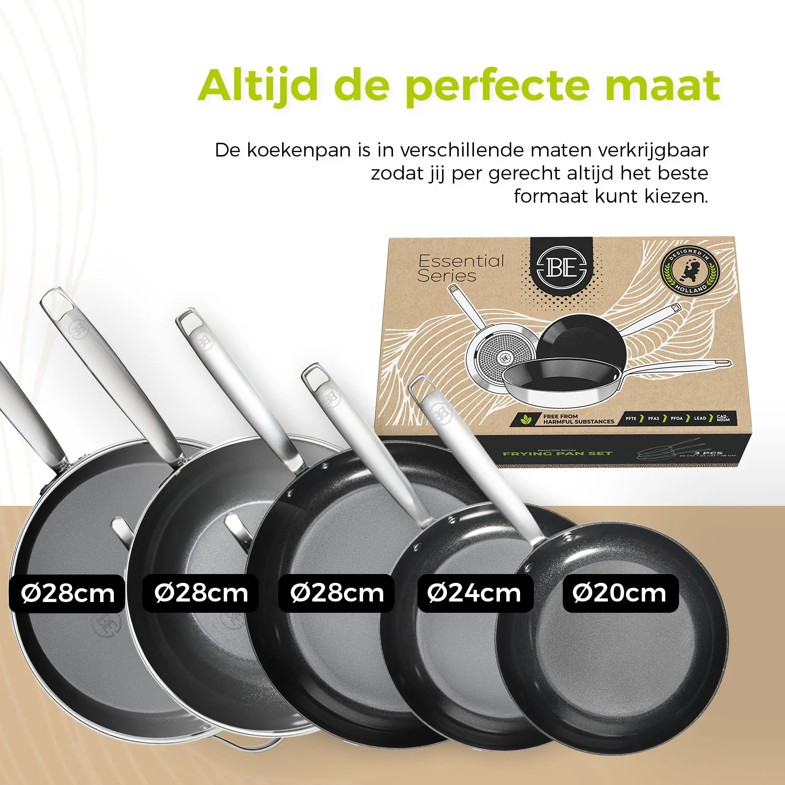 - BE Living Essential Series Koekenpan van Ø 20, 24 en 28 cm, Hapjespan Ø 28 cm en Wokpan met deksel Ø 28 cm