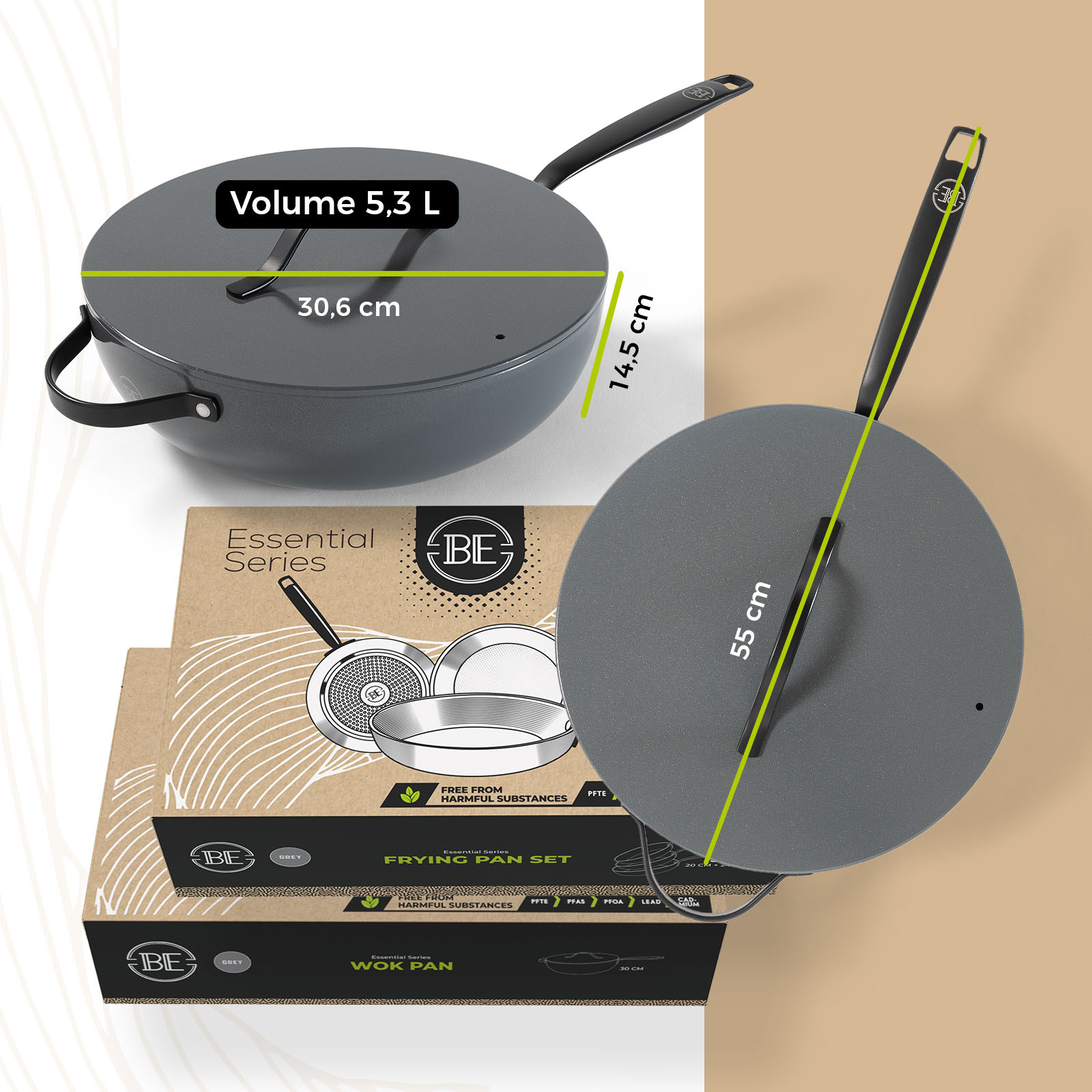 BE Living presenteert een pannenset met koekenpannen van Ø 20, 24 en 28 cm + een wokpan van Ø 30 cm, perfect voor alle warmtebronnen inclusief inductie én vrij van PFAS. Een essentiële aanwinst voor iedere moderne keuken.
