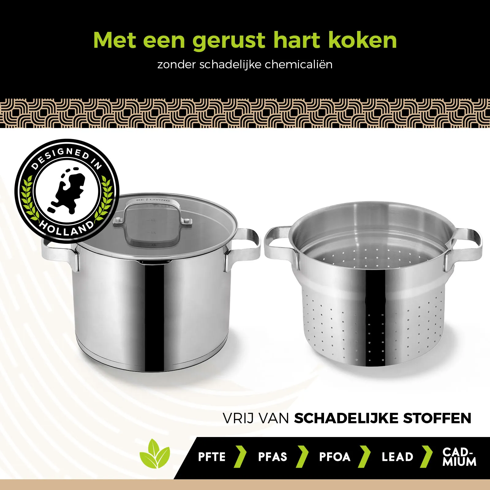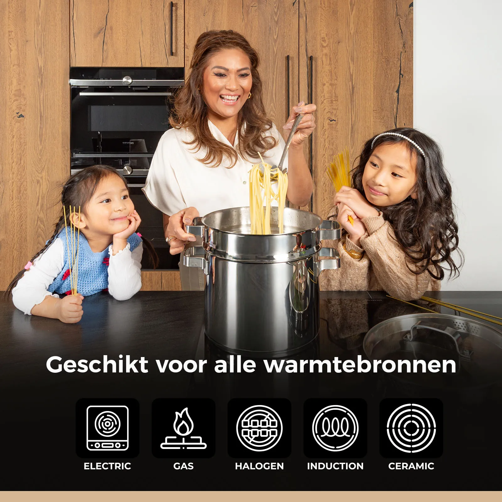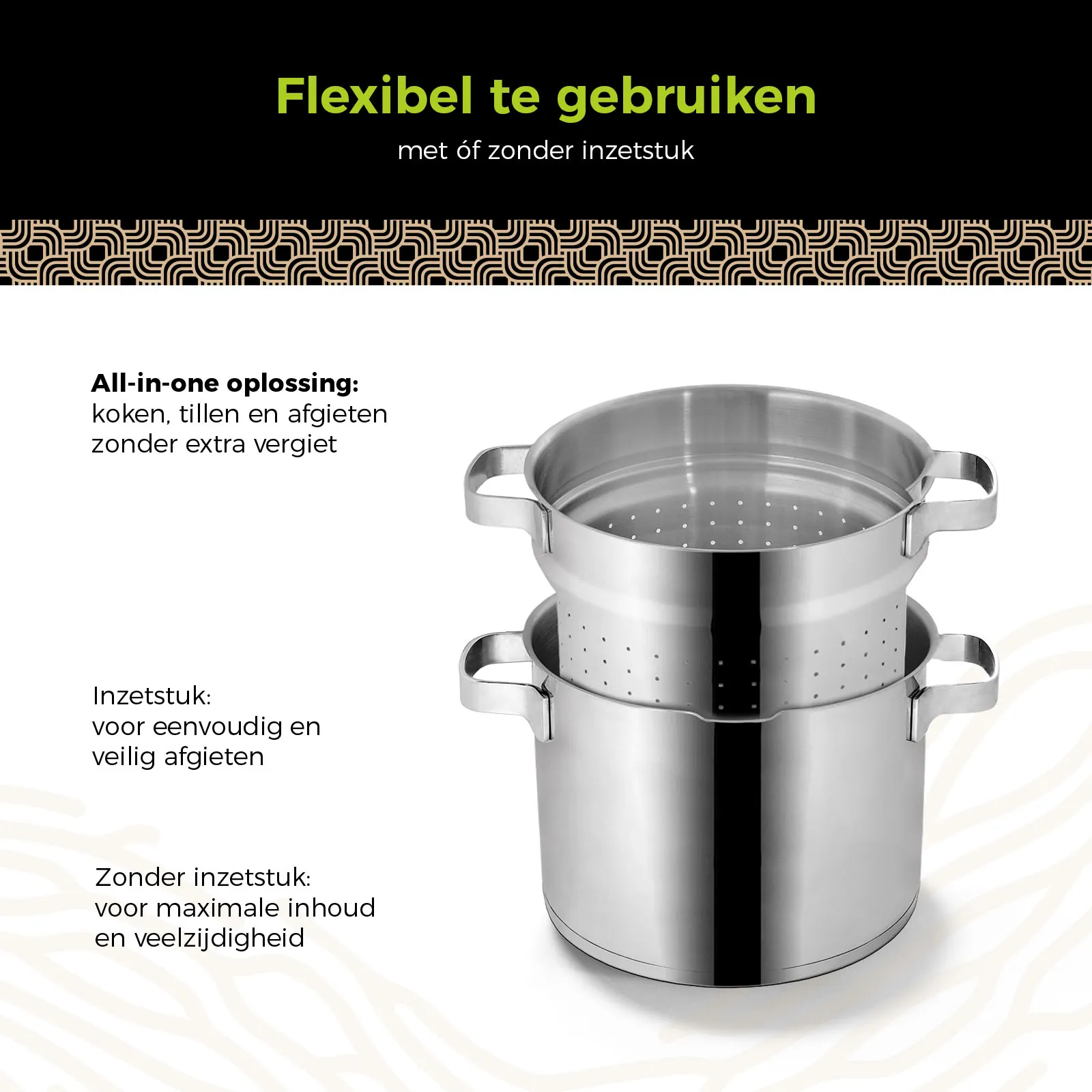 Ondanks het label ‘pastapan’ is deze kookpot verrassend veelzijdig. Kook er aardappelen in, maak er een grote pan soep mee of gebruik hem voor rijst en stoofgerechten. Dankzij de inhoud en vorm is deze pan een echte alleskunner in jouw keuken.
