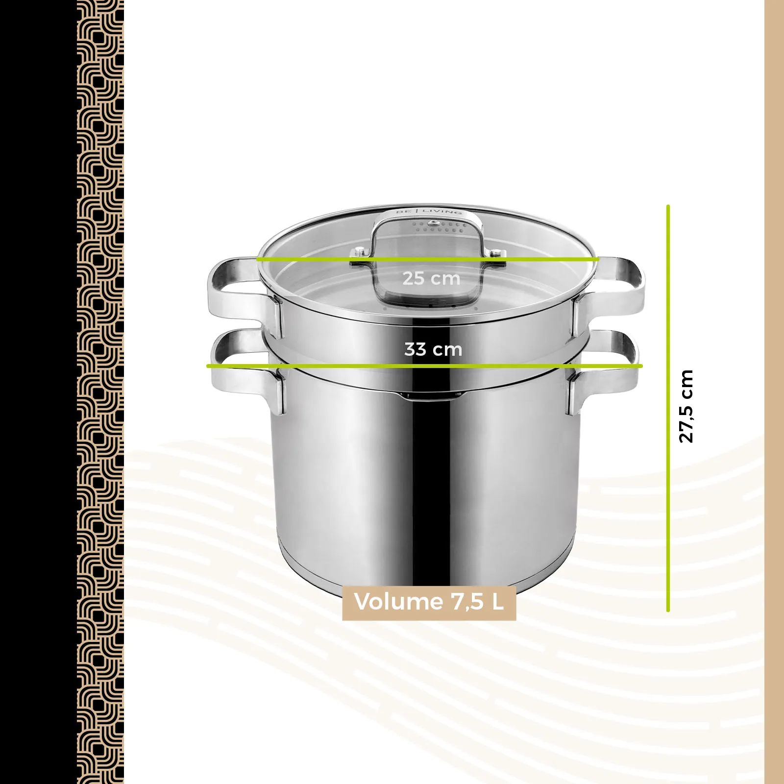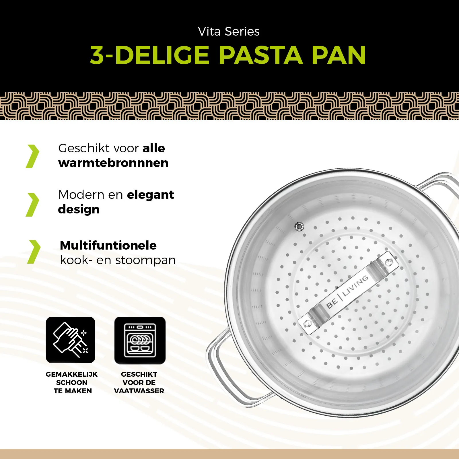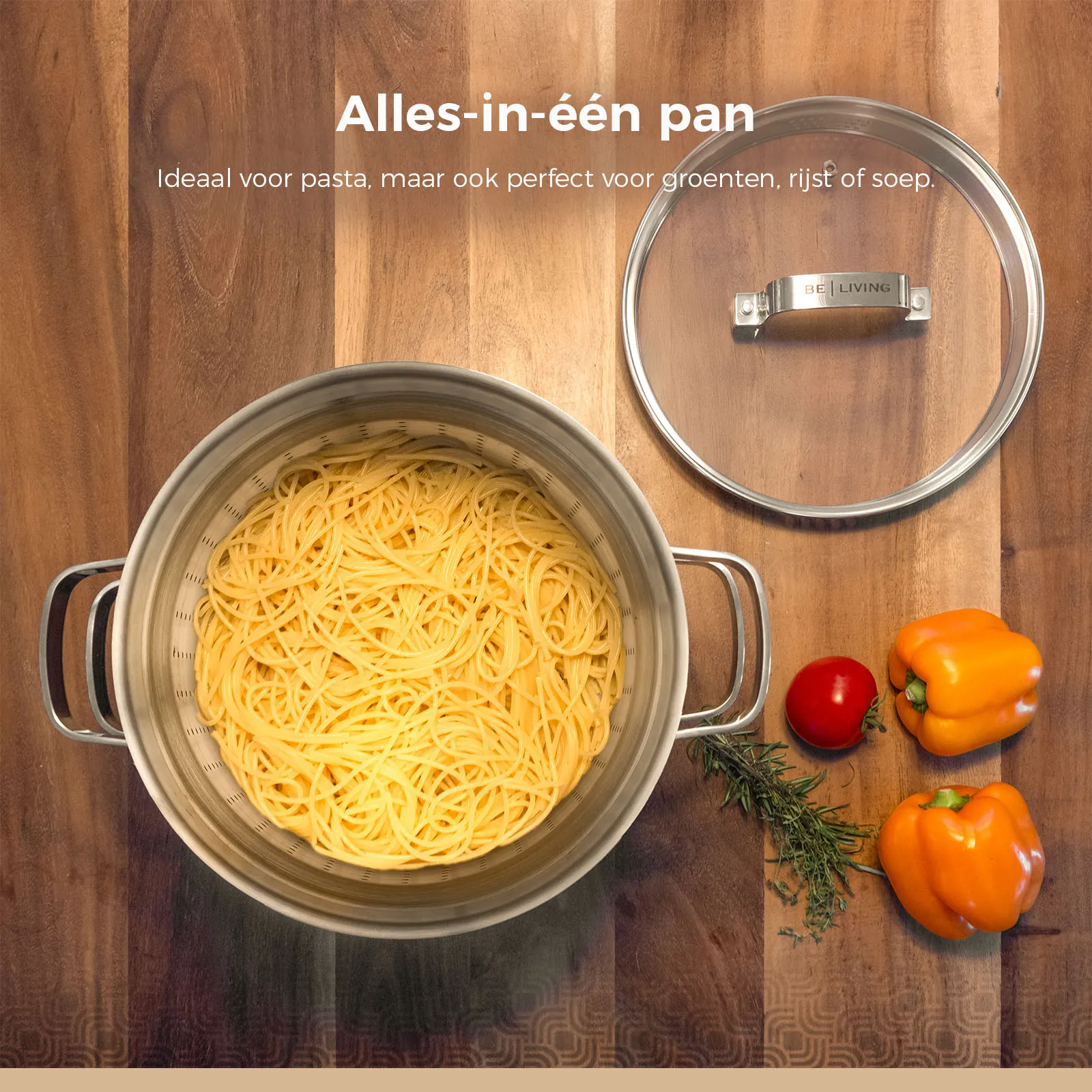 Ondanks het label ‘pastapan’ is deze kookpot verrassend veelzijdig. Kook er aardappelen in, maak er een grote pan soep mee of gebruik hem voor rijst en stoofgerechten. Dankzij de inhoud en vorm is deze pan een echte alleskunner in jouw keuken.