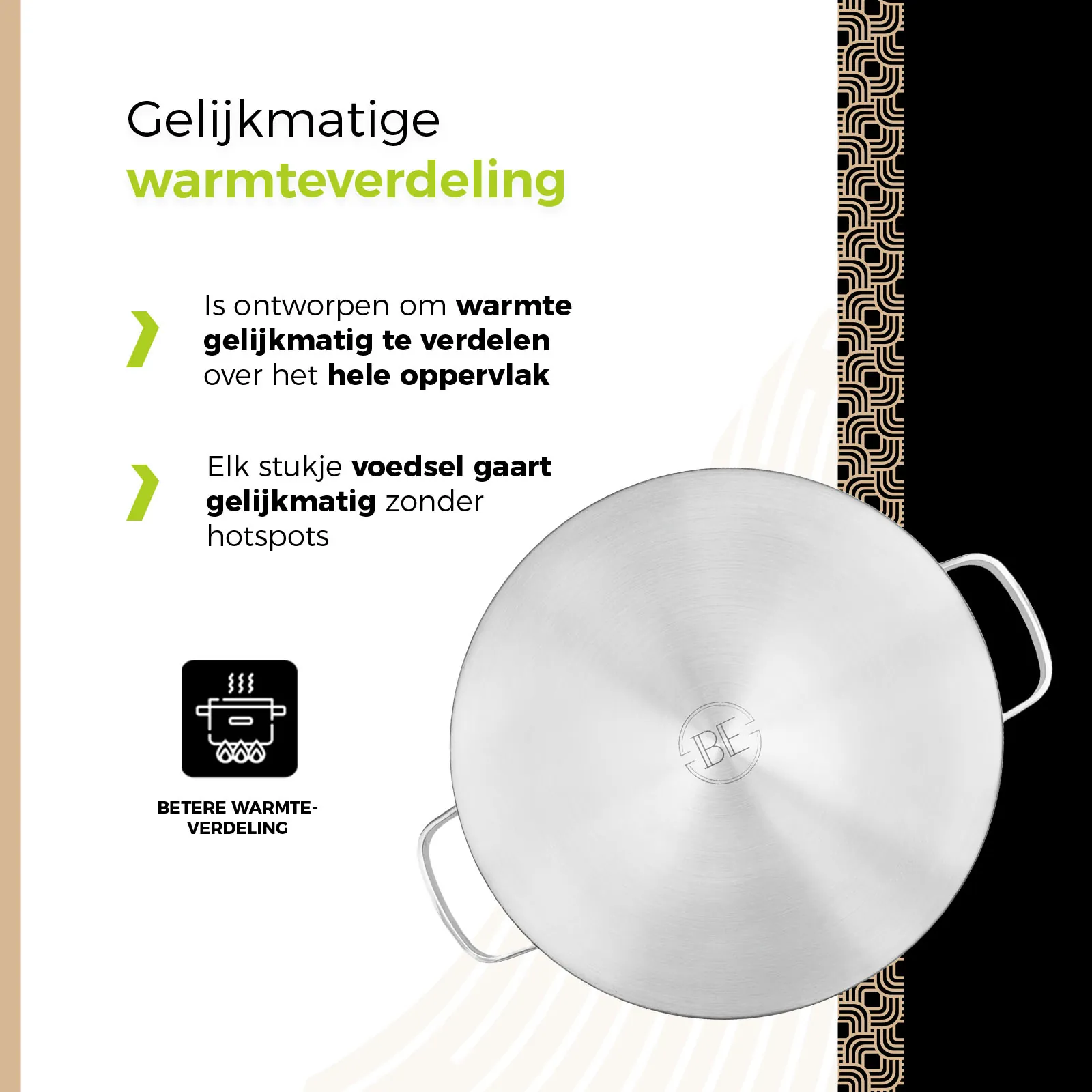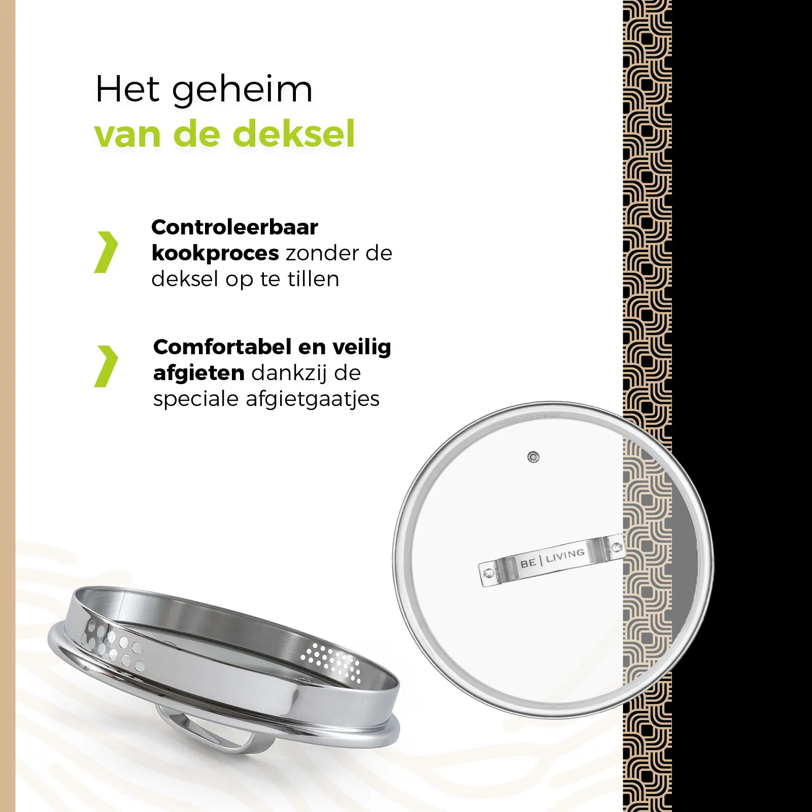 Van inductie tot gas, deze pan werkt op elke warmtebron. Dankzij de stevige RVS bodem wordt de warmte efficiënt verdeeld, zodat jij precies kunt koken zoals jij dat wilt. Ideaal als jij op zoek bent naar een pan die overal inzetbaar is.