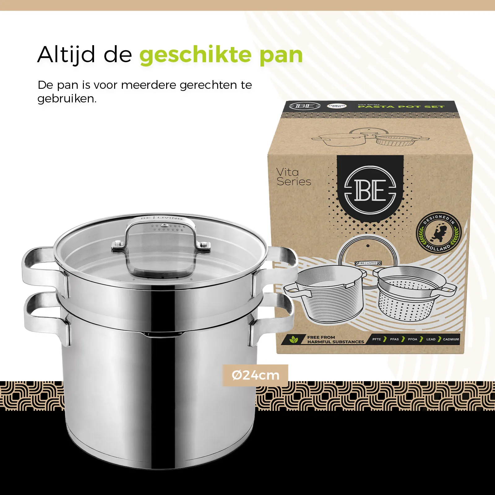 Of jij nu houdt van tagliatelle, fusilli of verse ravioli, deze pastapan biedt de ruimte en warmteverdeling die jij nodig hebt voor een perfect gekookte pasta. De brede diameter voorkomt plakken, en door de hoge wanden blijft alles netjes in de pan. Zo serveer jij moeiteloos heerlijke maaltijden, keer op keer.