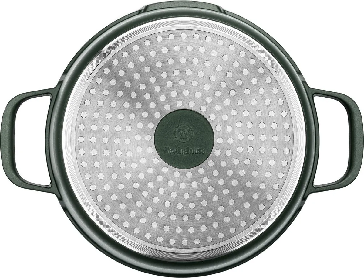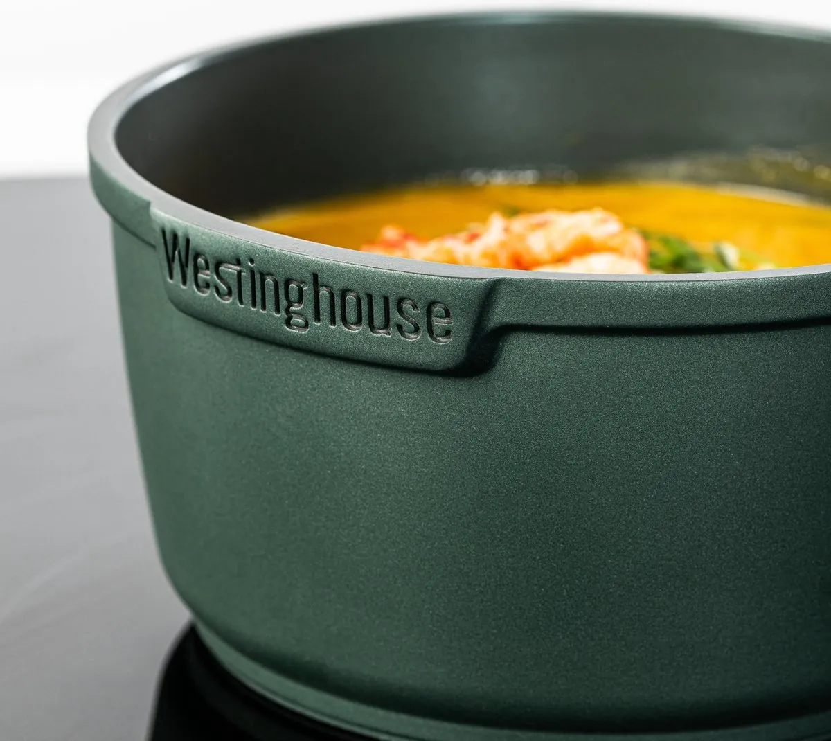 Deze Westinghouse pannenset Performance Series bevat Braadpan 24cm/28cm + Hapjespan 32cm/28cm + Wokpan 28cm + Koekenpan 24cm/28cm + Grillpan 28cm + Steelpan 18cm in het groen, een complete pannenset dus!